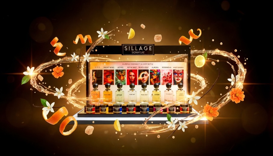 WELCOME TO SILLAGE SIGNATURE A Unique Personality in Every Bottle CHOOSE YOUR PERSONALITY NIGHT GODDESS AURORA ROSANOVA ROYAL MIST BLACK HOLE AETHER DESERT WIND C E O STAND LOCATOR
